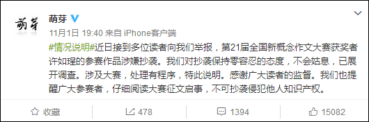 @萌芽 1日隨後發微博稱,近日接到多位讀者向我們舉報,第21屆全國新概念作文大賽獲獎者許如珵的參賽作品涉嫌抄襲。我們對抄襲保持零容忍的態度,不會姑息,已展開調查。涉及大賽,處理有程序,特此説明。感謝廣大讀者的監督。我們也提醒廣大參賽者,仔細閲讀大賽徵文啓事,不可抄襲侵犯他人知識產權。