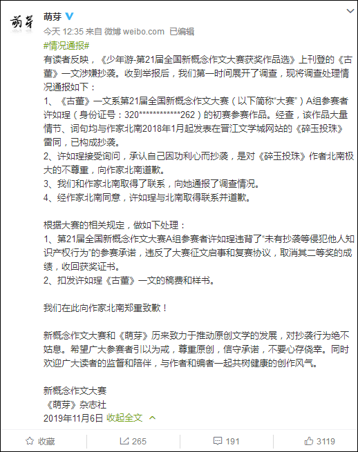 針對“新概念作文大賽獲獎作品涉嫌抄襲”一事,《萌芽》雜誌官方微博@萌芽 11月6日宣佈,第21屆全國新概念作文大賽獲獎者許如珵的獲獎文章構成抄襲,取消其二等獎成績,收回獲獎證書。日前,許如珵作品被舉報涉嫌抄襲。經調查,其獲獎文章《古董》大量情節、詞句均與作家北南2018年1月起發表在晉江文學城網站的《碎玉投珠》雷同。
