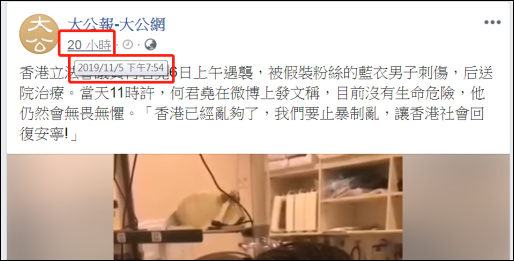 根據大公網提供的網頁截圖,被篡改的時間線顯示該帖發佈於2019年11月5日下午7:54分,但點擊時鐘圖標可見,實際上傳時間為11月6日上午11:54分。儘管輕易就能夠看出破綻,但不少“縱暴派”網民故意視而不見,在大公網臉書下冷嘲熱諷。
