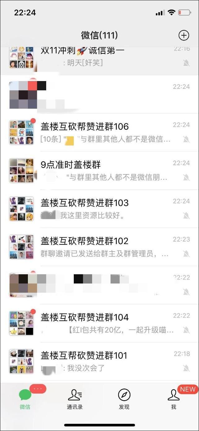 黃女士的微信裏的頂端位置,幾乎被各種名稱相似的互助蓋樓羣佔據了。“雙十一衝刺,誠信第一”“蓋樓互砍幫贊進羣”“9點準時蓋樓羣”。每天9點一過,這些羣就熱鬧起來了。