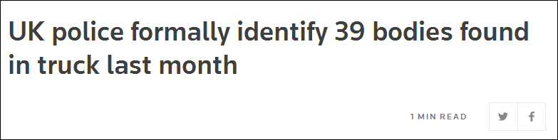 據觀察者網此前報道,英國警方1日晚上發表聲明稱,相信此前在一輛冷凍卡車中發現的39名死者全部是越南人。
