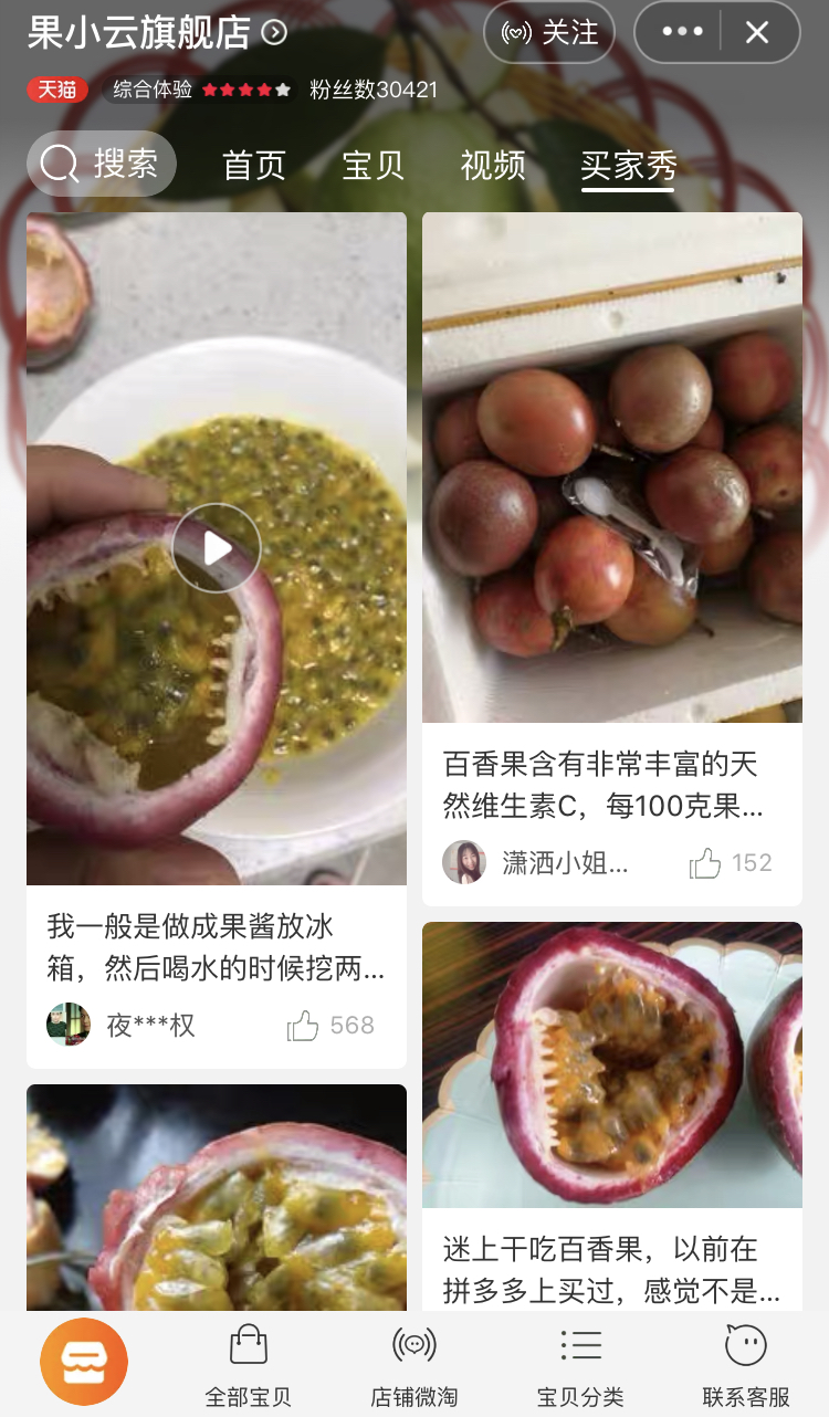 目前,店鋪“寶貝”一欄暫時顯示無貨,但買家秀中的信息仍顯示。