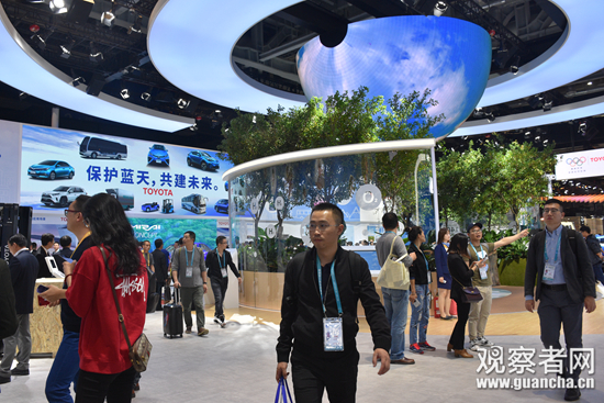 並非所有車企都把寶壓在鋰電池上。在與大眾齊名的豐田展台,參展商別出心裁地將展台佈置成森林的模樣。“保護藍天,共建未來”成為豐田此次參展的主題,而承載這一主題的重點則是氫能。