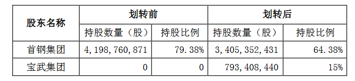 本次股份無償劃轉前,首鋼股份總股本為5289389600股,其中首鋼集團持有4198760871股,佔總股本的79.38%,為公司控股股東。本次股份無償劃轉完成後,公司總股本保持不變,首鋼集團持有3405352431股,佔總股本的64.38%;中國寶武持有793408440股,佔總股本的15%。