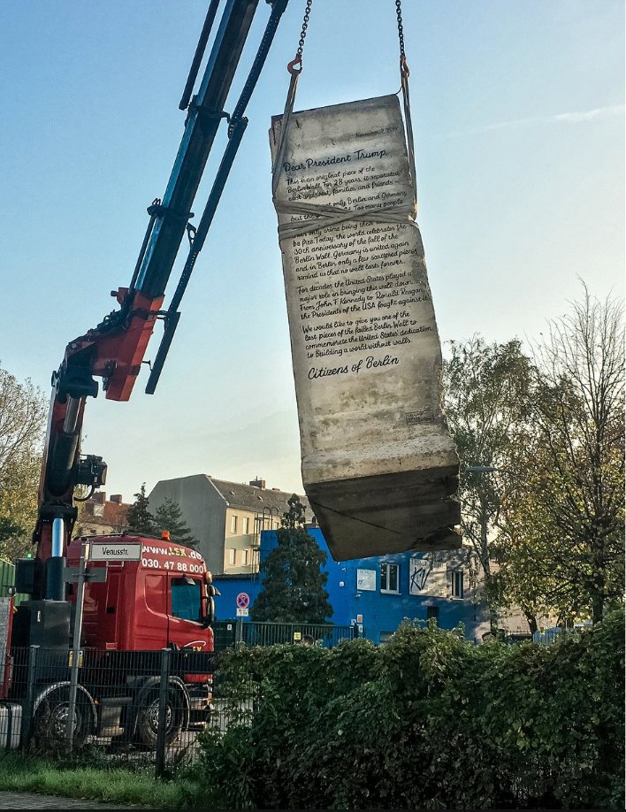 11月9日是拆毀柏林牆30週年的紀念日。這天,一家德國非盈利組織寄給特朗普一份“禮物”:一塊重約2.7噸、來自柏林牆的磚塊。該組織欲諷刺特朗普的邊境牆計劃,還附言“沒有牆能永遠屹立”。