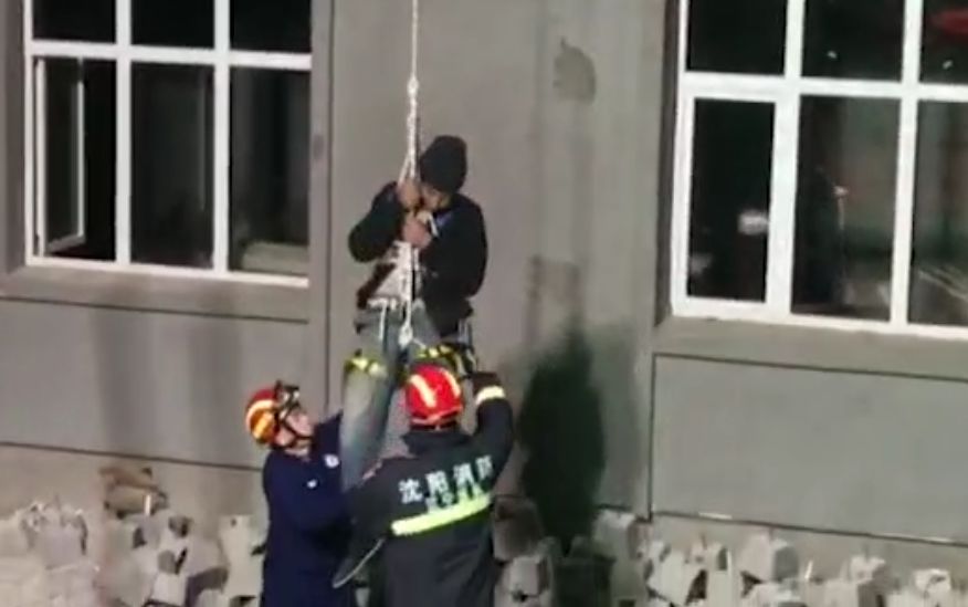 被困在塔吊上超過6小時,因天氣寒冷失去行動能力,瀋陽消防救援隊員爬上40米高的塔吊,給被困者穿上全吊帶,用繩索固定,最終把被困人員安全解救下來。