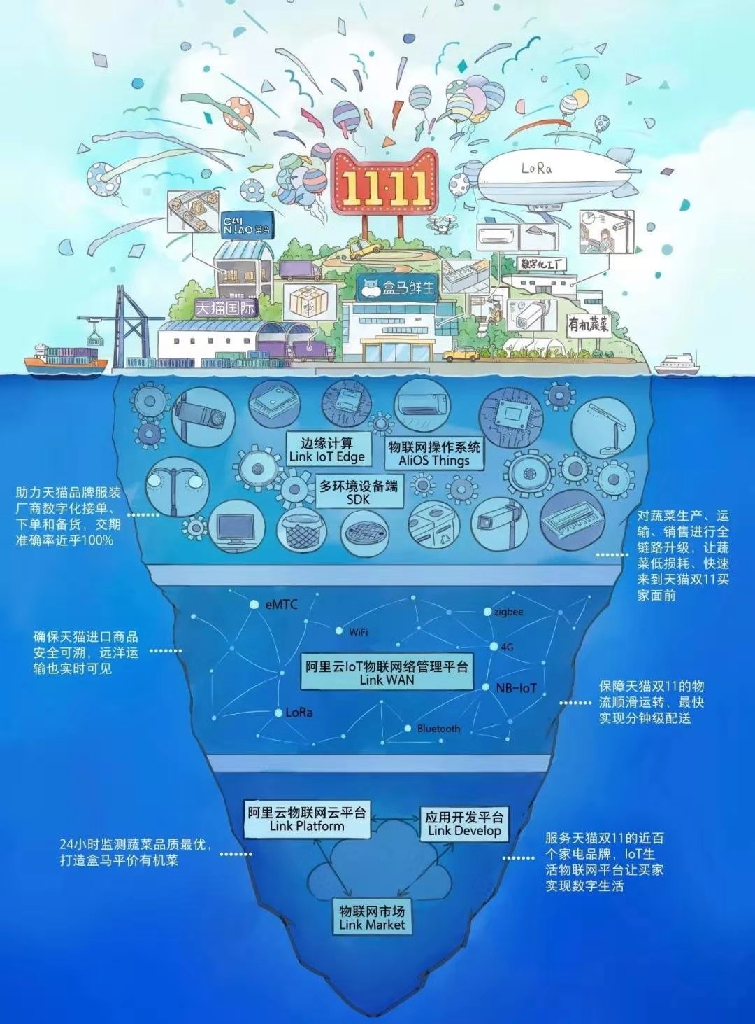 而在如今的天貓雙11中,阿里內部已開始了一場內部技術變革。例如IoT技術已經在天貓雙11的舞台上施展拳腳,在生產側,基於對數據的挖掘、分析、洞察基礎上,IoT技術正在幫助天貓品牌服裝廠商數字化接單、下單和備貨,交期準確率近乎100%。在消費側,國內消費者收到商品後,通過手機淘寶掃一掃IoT貨品碼可全球追蹤溯源。