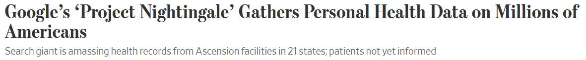 報道援引知情人士的話説,上述收集項目被稱為“夜鶯計劃”(Project Nightingale)。而該計劃可能是谷歌迄今為在醫保行業站穩腳跟而做的最大努力。目前,亞馬遜、蘋果和微軟也都在積極推進醫療保健,儘管他們尚未達成上述協議。