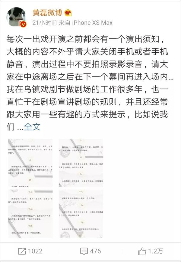 昨日,演員黃磊在微信和微博都發表了一篇有關“劇場秩序”的文章,特別提到觀眾手機對演員表演造成的巨大幹擾,以及對劇場演出效果產生的種種不良影響,並苦口婆心勸導大家:“進劇場手機關掉放包裏,真的很重要。”