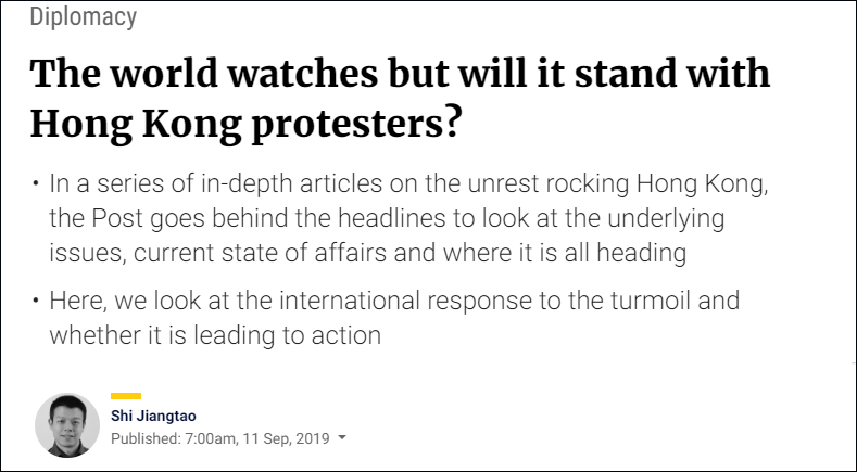 對此,香港《南華早報》11日發出疑問,“全世界都在注視香港,但他們會支持‘示威者’嗎”?