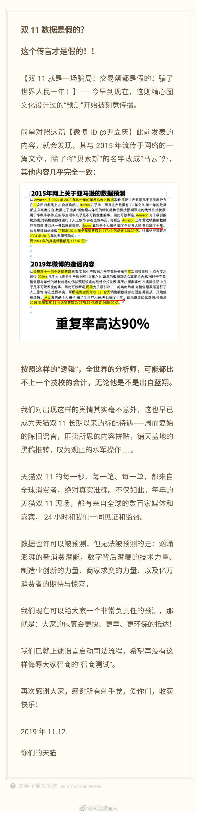 天貓再回應“雙11數據造假”:侮辱智商,已啓動司法流程 2019-11-13 針對“網友質疑天貓雙11數據造假”一事,天貓發言人官博再次回應稱,已就這則謠言啓動司法流程,希望再沒有這樣侮辱大家智商的“智商測試”。