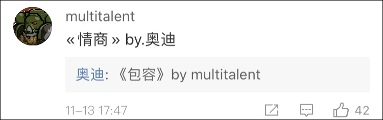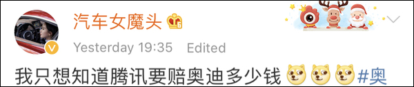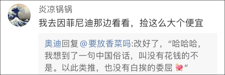 面對網友的關切,@奧迪 自我安慰道:“沒有花錢的不是,也沒有白挨的委屈。”