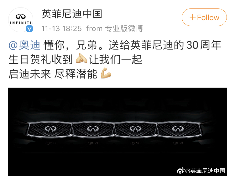 隨後,免費“蹭”廣告的@英菲尼迪中國 在線喊話@奧迪,謝謝兄弟送來的“30週年生日賀禮”。