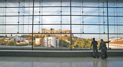 從雅典衞城博物館內拍攝的遠處的雅典衞城。 新華社發