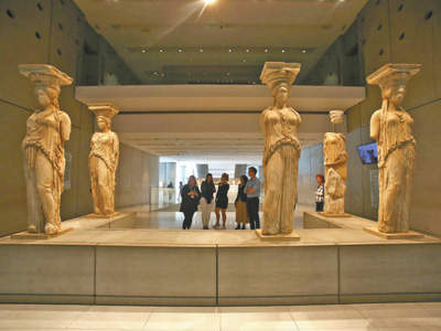 他們走到二層的少女廊柱前,仰望凝視。少女廊柱原本屬於衞城的伊瑞克提翁神廟。經歷兩千多年歲月滌盪,眼前的雕塑依然紋路精美、線條富有動感。令人遺憾的是,一組6個少女廊柱並不完整,其中一個因遭受掠奪而流落海外。