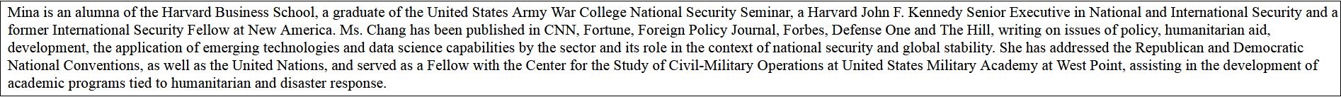 另外,她還曾宣稱自己曾在聯合國一個使用無人機提供人道主義救援的小組擔任過顧問,但同樣沒有記錄可以證明她的這一説法。
