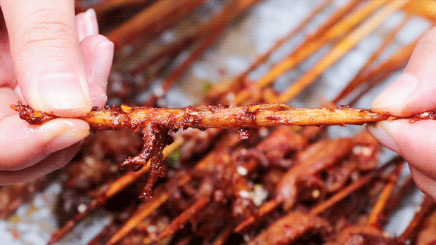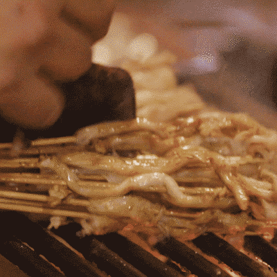 不同於其他地區的燒烤,巡場燒烤不醃不煮直接生烤,在大小火的交替烤制下,入味的豬鼻筋散發着奇異的酥香。經過烤制,表面有層膠感的豬鼻筋看起來很軟,入口後,有種介於骨髓和黃喉之間的脆生,細細嚼下去,豬鼻筋便在牙齒間摩擦出咔咔的聲響。