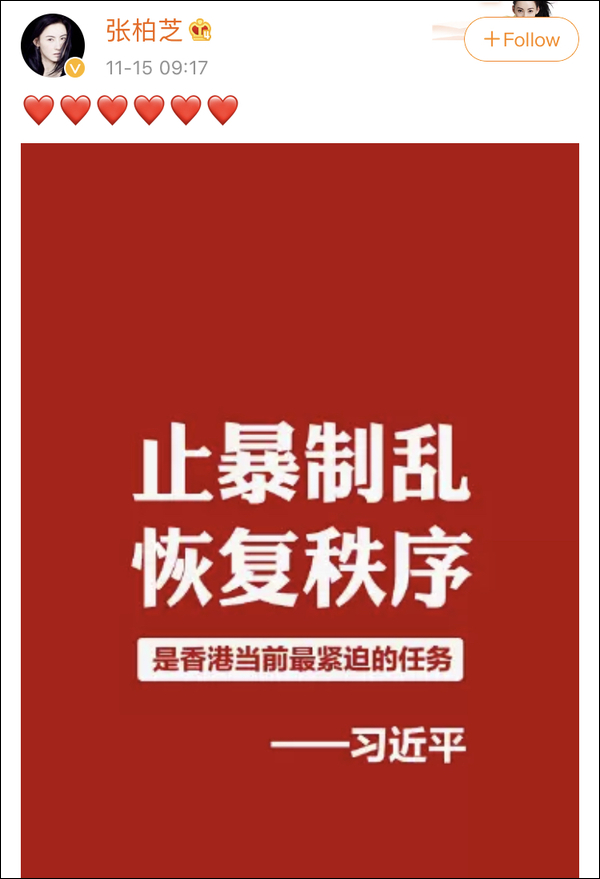 15日一大早,中國香港影視女演員、歌手@張柏芝 點讚了該條微博,並在第一時間將標語圖片轉發到其微博和國外社交網站Instagram,力挺“止暴制亂”。
