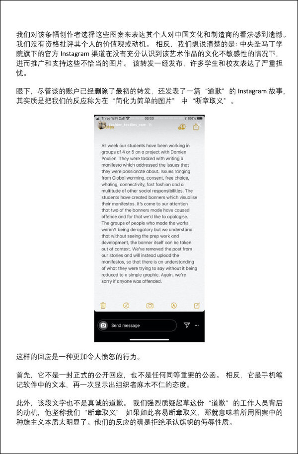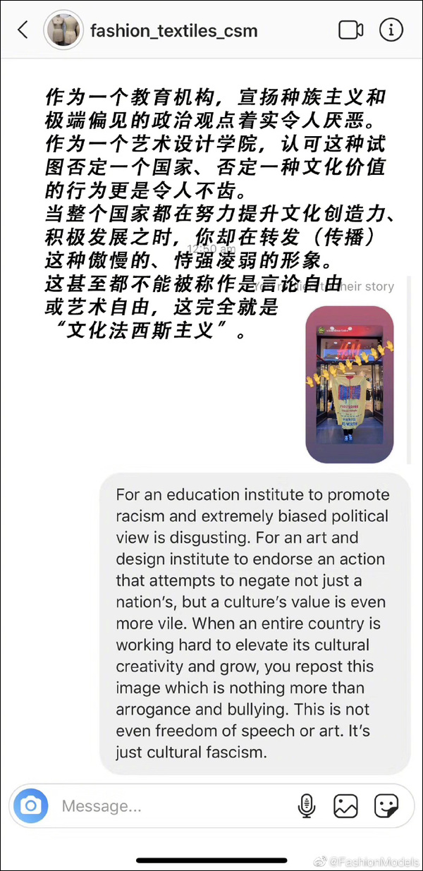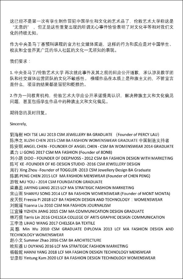消息一出,引發中國時尚界的強烈反對,中央聖馬丁的中國校友設計師@XUZHI_CHEN 立即組織該校校友聯合向學校遞交公開信以示抗議。