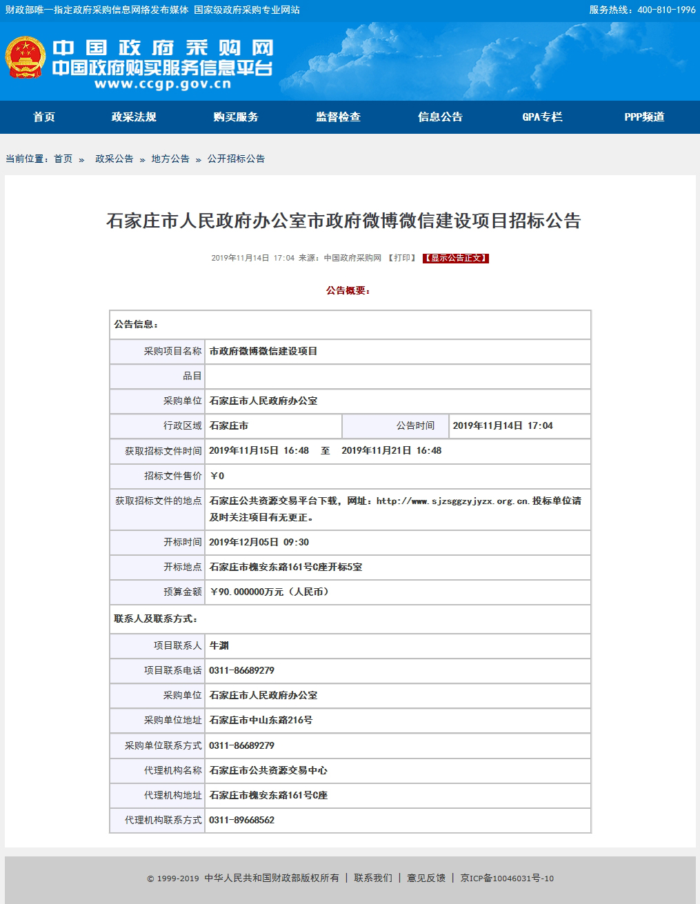 澎湃新聞注意到,這份招標公告由中國河北政府採購網於11月14日發佈,公告期限為5個工作日,項目名稱為“市政府微博微信建設項目”,評標方法和標準為“綜合評分法”,採購項目編號為“SJZGK20192106”,採購人為“石家莊市政府辦公室”,採購預算金額為90萬元,開標時間為“2019年12月5日上午9:30”,投標保證金金額為1萬元。