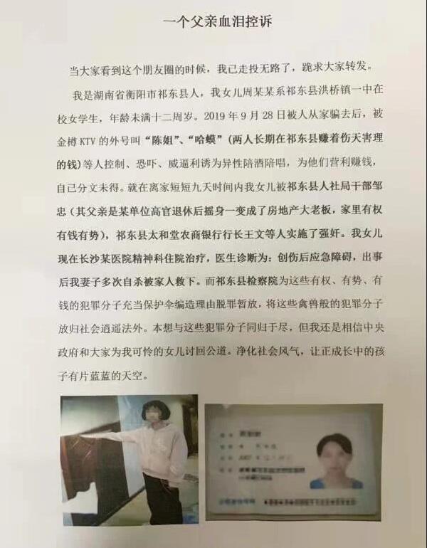 周先生18日向記者反映,今年9月28日17時許,其女兒周婷(化名)的同年級不同班的同學王某茜以輔導作業為由從家中騙走,並帶至祁東縣“金樽KTV”。隨後,張某怡、陳某升、周某雲等人以控制、恐嚇、威脅等手段,迫令周婷謊報年齡為異性陪酒伴唱。其間,周婷因害怕被打,只得任由擺佈。