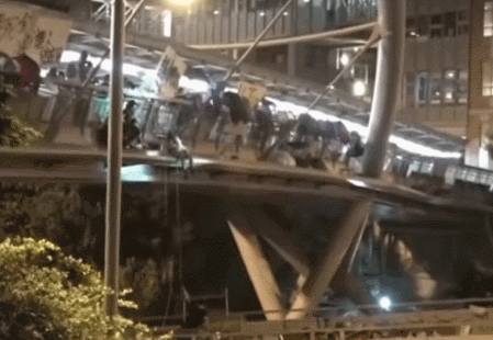 至18日晚深夜,暴徒上演了花式“撤離”。據《東方日報》消息,一批暴徒在晚上10點多時突圍到理大通往第八校區,橫跨漆鹹道的天橋,用繩子吊運的方法,吊人到地面逃亡。但是被警方截停。