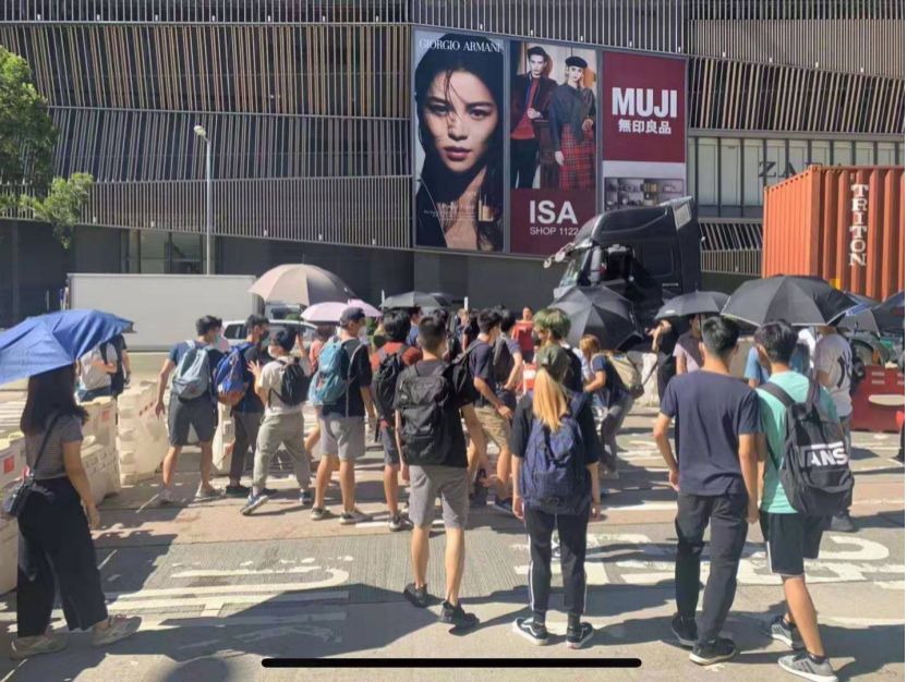 路的正中間,是雜物堆砌的路障,將我們和示威者分隔在馬路兩端。密密麻麻的人羣,人數遠多於我們,而且和以往不一樣,示威者不再是穿着統一的黑衣黑褲,難以辨別真實身份。唯一能夠幫我們辨認的,就是他們手中的武器。