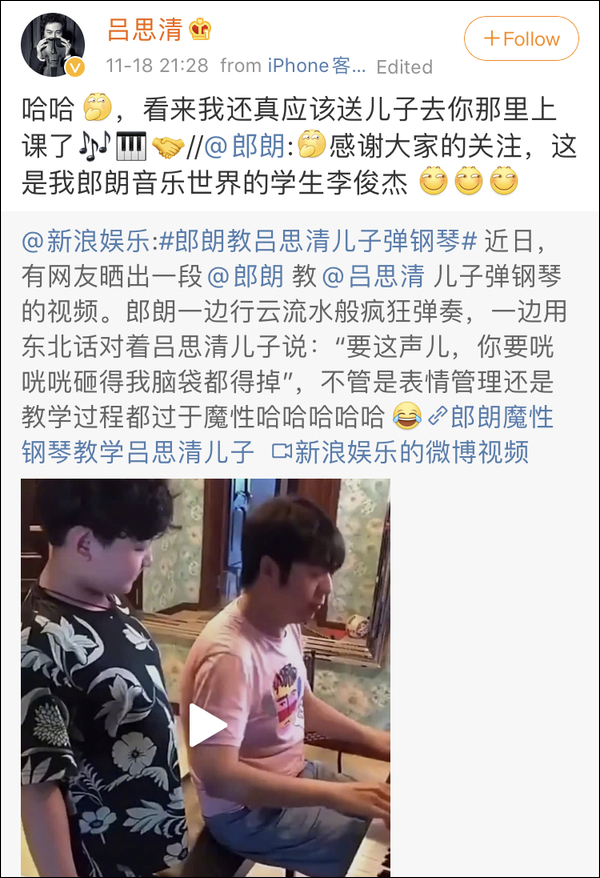 @呂思清 也轉發調侃道:“看來我還真應該送兒子去你那裏上課了。”