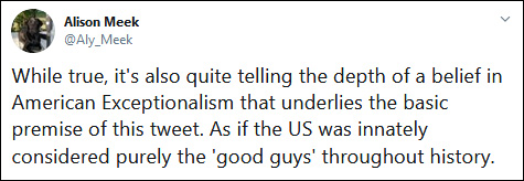 “這充分説明了美國例外論的影響程度有多深,美國例外論是這條推特的基本前提,好像美國在歷史上天生就是個純粹的‘好人’一樣。”