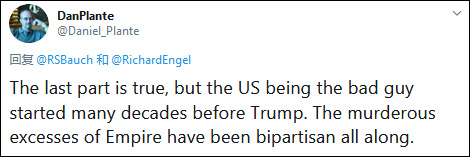 “最後那部分(美國是壞人)是對的,不過在特朗普之前幾十年美國就開始是壞人了。兩黨在帝國的殘暴行徑上一直是一致的。”