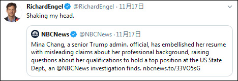 有趣的是,恩格爾在發完上述推特之後不到半小時便轉發了一條NBC有關“韓裔女歌手靠簡歷造假當上美國務院副助理國務卿”的新聞,並無奈地説了句“搖搖頭”。