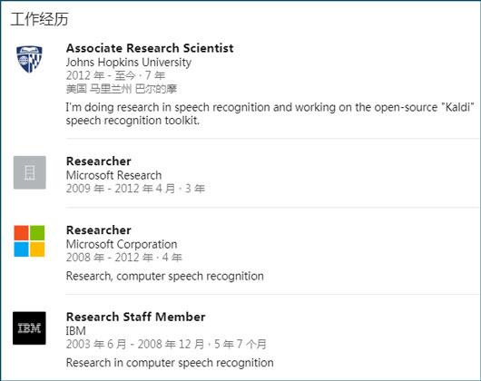 畢業後,IBM和微軟先後向他伸出橄欖枝。丹尼爾在兩家巨頭累計工作近10年之久,一直致力於研究計算機語音識別技術,並在2012年,他開始進入約翰·霍普金斯大學工作。