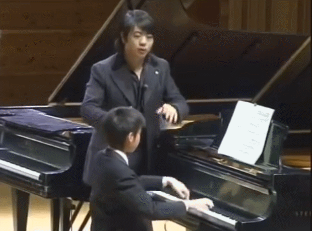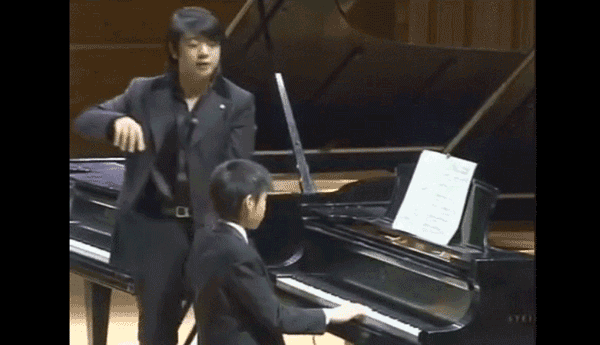 當時,音樂響起,小男孩彈起了《莫扎特奏鳴曲K330》,而一旁指導的郎朗,也開始用表情演奏音樂。