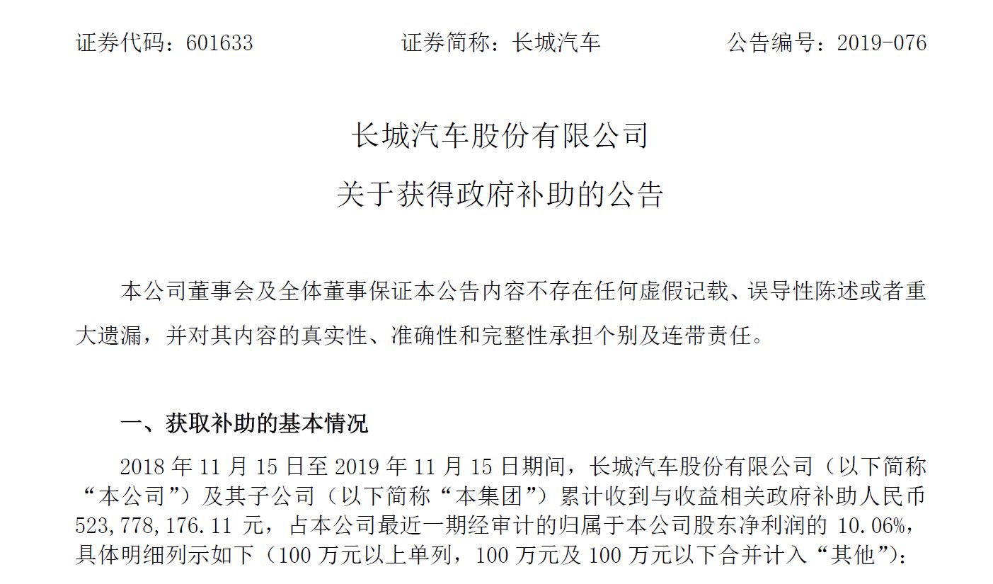 11月19日晚,長城汽車發佈《關於獲得政府補助的公告》顯示,2018年11月15日至2019年11月15日期間,長城汽車及其子公司累計收到與收益相關政府補助人民幣約5.24億元,佔其最近一期經審計的歸屬於公司股東淨利潤的10.06%。