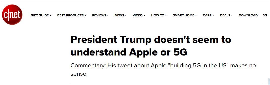 IT新聞網站CNET毫不留情地説,特朗普恐怕是還不懂啥是蘋果,啥是5G。