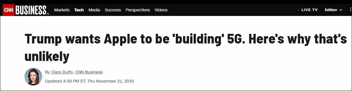 韋德布什證券公司的分析師丹·艾夫斯認為,特朗普對庫克説要蘋果建5G,指的就是上述考慮,即中國在5G上已經領先了,特朗普想抓住一點希望——蘋果。