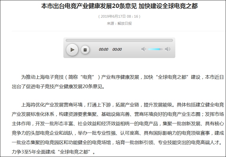 上海已經明確了電競發展的方向和政府應該怎麼去扶持它。像《文創50條》、《電競20條》,打造全球電競之都,今年上海每個區都有具體的扶持政策出來。這對於全國來説,都具有參考示範價值。