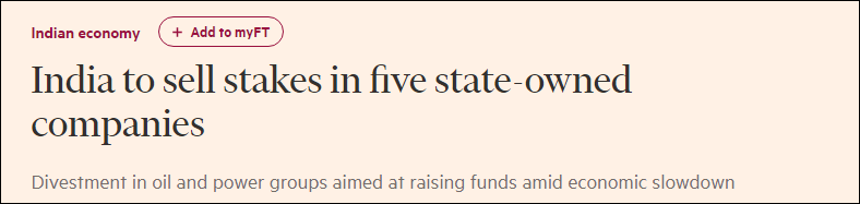 印財政部長尼爾馬拉·西塔拉曼(Nirmala Sitharaman)稍早前表示,政府決定通過出售國有資產來籌集資金,出售包括巴拉特石油公司、印度國家航運公司、印度集裝箱公司、特赫裏水電開發公司、印度東北電力集團公司在內等5家國有企業的持股。