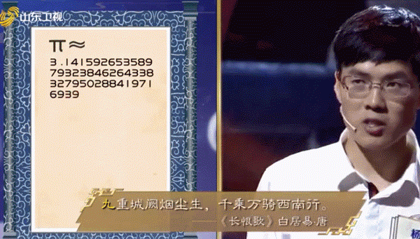 《國學小名士》這段視頻中的規則是這樣的:主持人逐一給出π的數字3.141592654.…..選手需要説出含有此數字的詩句。