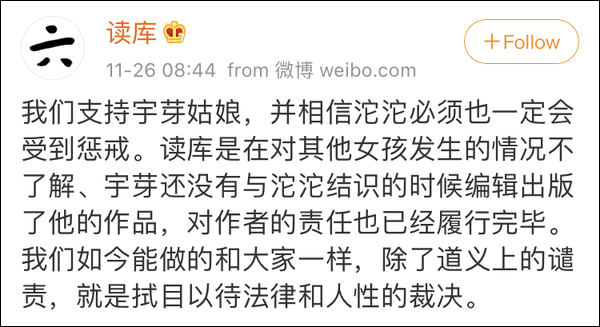 11月25日,papi醬公司papitube旗下博主@宇芽YUYAMIKA (下文簡稱宇芽)被44歲前男友@沱沱的風魔教 (下文簡稱沱沱)家暴一事衝上熱搜後,26日,曾出品過沱沱書籍的讀庫官微發文稱,支持宇芽,並相信沱沱“必須也一定會受到懲戒”。隨後觀察者網發現,讀庫已經下架了男方的作品。