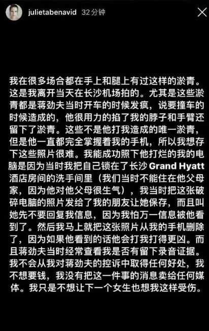 不過,27日,蔣勁夫外籍前女友再發文,並曬出手臂淤青照,稱:“我的手和腿上有很多這樣的淤青,都是他掐我脖子和手臂時留下的,如果我想拍照片保留證據,他會打我打得更兇。”