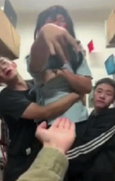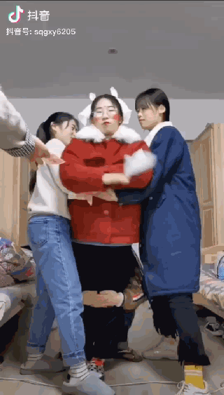 模仿不倒翁是個體力活,一人負責抱起,一人負責搖晃,妹子的力氣看起來還是很大嘛。