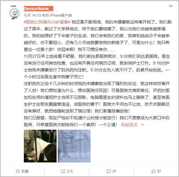 當天下午,微博用户@Deoxyribose__發文稱死者系其未婚妻。患者就診事院方未進行檢查,未開具病歷。其未婚妻死亡後,院方推卸責任,並稱有醫院護士在朋友圈詆譭其未婚妻,死者遺體還被強制送到殯儀館。該用户表示自己不希望成為大家中的醫鬧,只求一個真相。