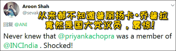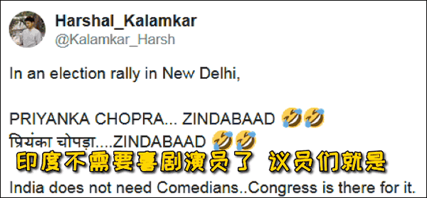 難道不該喊國大黨領導人普麗揚卡•甘地的名字嗎?咋成了女演員普麗揚卡•喬普拉“萬歲”了呢?