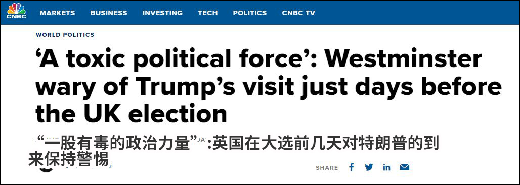 美國媒體CNBC在12月2日的報道中採訪了多位學者,他們都認為,特朗普在大選前10天抵達英國,可能會給約翰遜帶來麻煩。這些學者有人將特朗普稱為“一股有毒的政治力量”(a toxic political force),有人則提醒要小心“妖怪”(bogeyman)。