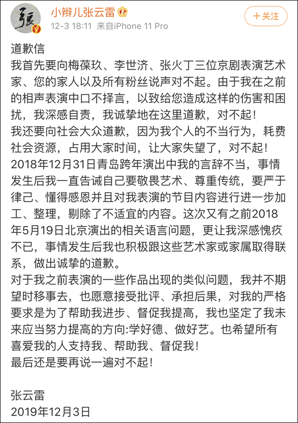 12月3日傍晚,因在表演中用惡俗語句調侃侮辱梅葆玖、李世濟、張火丁等著名京劇表演藝術家,而引起京劇界強烈憤慨和嚴厲譴責的德雲社相聲演員張雲雷,沉默近兩週後終於道歉了。