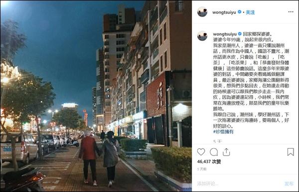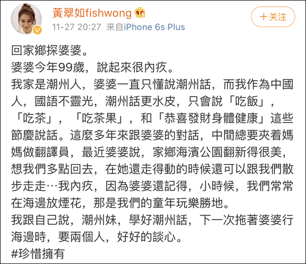 11月27日,黃翠如在微博和Instagram上同步發文,稱自己近期回到家鄉潮州探望今年99歲高齡的婆婆,但因為自己不太會説潮州話,與婆婆之間的溝通不得不依靠媽媽從中翻譯,自愧“作為中國人,國語不靈,潮州話更水皮”。