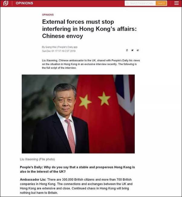 2019年12月1日,《人民日報》英文客户端評論版刊發記者強薇就香港問題對劉曉明大使的獨家專訪,題為《中國大使警告外部勢力,必須停止干涉香港事務》。內容如下:
