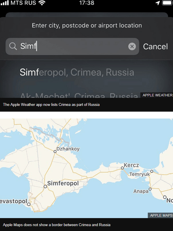 雖然在俄羅斯之外的國家蘋果展示的app地圖並沒有更改標註,但蘋果為俄羅斯用户特別變更了克里米亞地區地圖的有關標識,取消了克里米亞與俄羅斯之間的國際邊界,這一做法被美烏批評為,蘋果在“迎合”普京的克里米亞政策並使普京的行動“顯得正當化”,同時“忽略了包括美國在內的國際社會一直都將克里米亞認定為烏克蘭而非俄羅斯的一部分”。