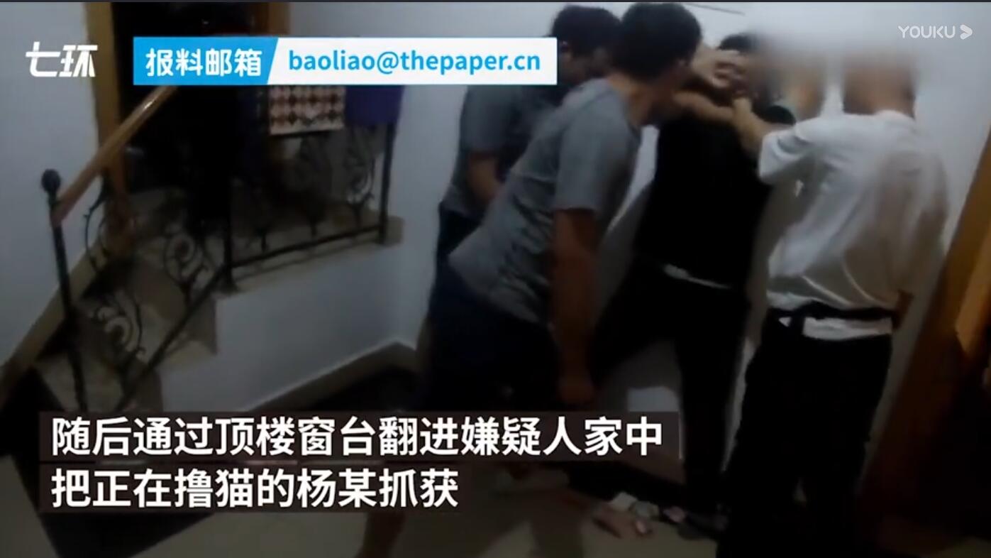 隨後,特警通過頂樓窗台翻進嫌疑人楊某家中,此時的楊某正在卧室裏擼貓,看見從天而降的特警,當場驚呆了!至此,重要涉黑團伙頭目楊某被大足警方抓獲。